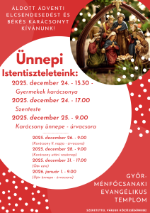 Szeretettel osztjuk meg ünnepi istentiszteleteink rendjét az alábbi bejegyzésben! Szenteste 15.30 és 17.00; Karácsony első és második napján 9.00-kor találkozhatunk!
